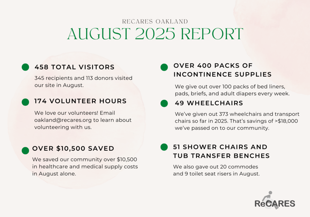 ReCARES Oakland is a vital part of the SF Bay Area community. Our patrons save hundreds of dollars every year by collecting healthcare and medical supplies from ReCARES. Come visit us in Oakland on Fridays from 12-4pm.