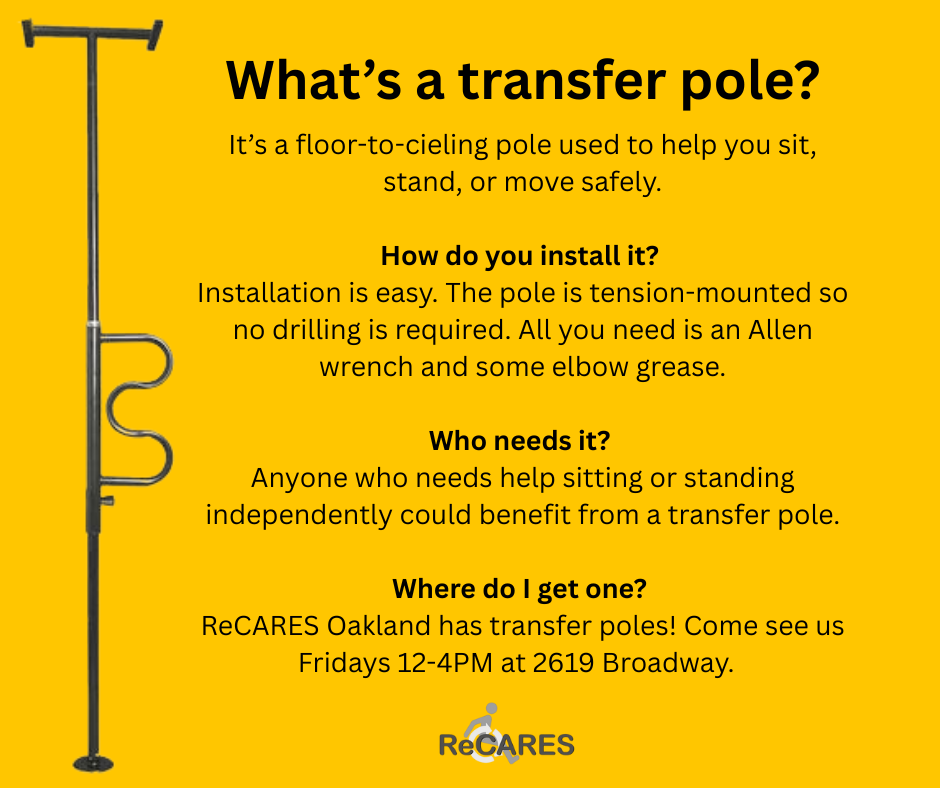 Is it time for you to get a transfer pole? / news-updates / By Kristin Hilty Is it time for you to get a transfer pole? Try one out at ReCARES Oakland! We’ll be open this Friday, 9/19 from 12-4pm. See you there!